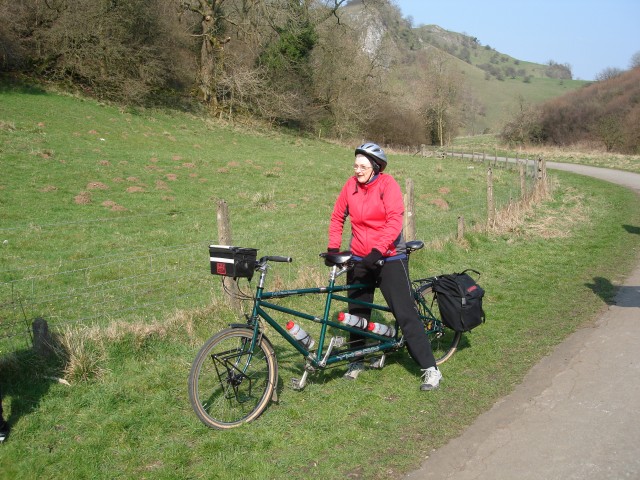 This time we headed towards Hulme End, which is the northern extremity of the Manifold Trail. This is Derbyshire at its best, or would be apart from one small snag: we had crossed the border and were now in Darkest Staffordshire. We followed the trail, through a tunnel where appropriate train noises were made, and out the other side to Wetton Mill, where we had probably the earlies Elevenses stop in the history of Sunday rides. However, it was well worth it as the sun was shining, the wind had dropped, there were ducks on the water, chiffchaffs in the willow trees and the tea was first rate. Clare bought a large piece of cake and shared it out – very good it was too!
