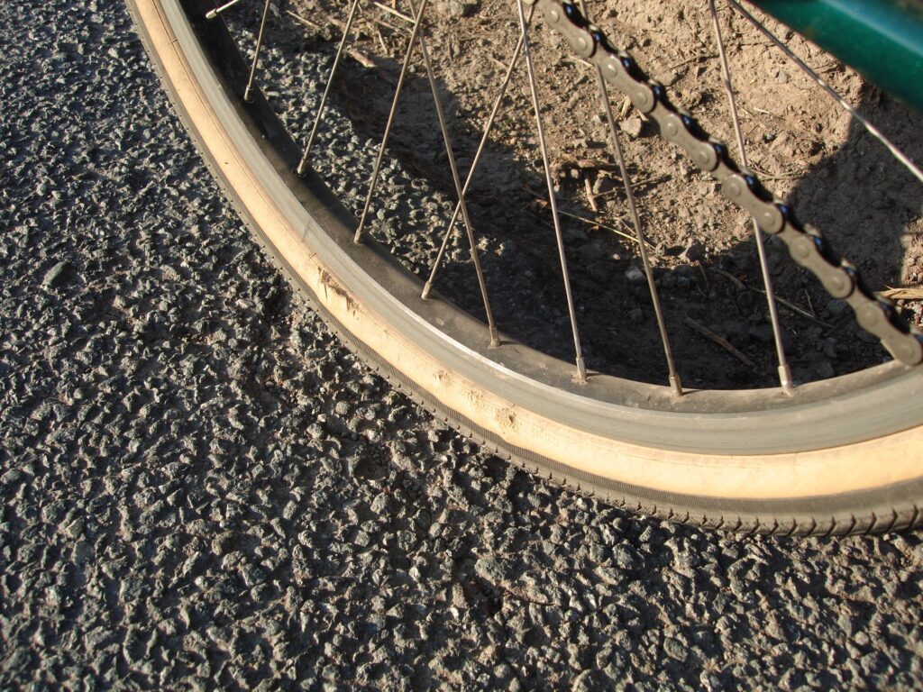 Our stops were becoming more frequent as Jan was suffering from saddle-sore and was also suffering from cramp in her right calf. As she was indulging in a little relieving yoga, I inspected the rear wheel again as it was still worrying me. The problem was immediately obvious: a tear in the wall of a brand-new Panaracer Pasela tyre, no doubt as a result of cycling on the dreadful sustrans route just north of Bristol.